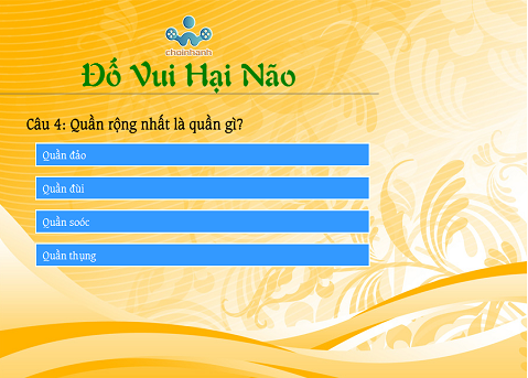 Các câu hỏi sẽ lần lượt được đưa ra, hãy click chuột vào đáp án mà bạn cho là chính xác nhất. Mỗi câu trả lời đúng bạn sẽ nhận được số điểm tương ứng.